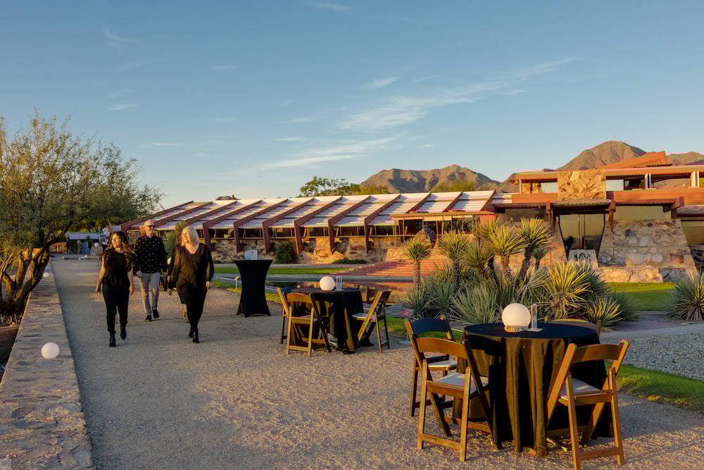 The Sunsets & Sips at Taliesin West offers relaxed evening gatherings at Frank Lloyd Wright’s iconic desert campus, where guests can enjoy stunning sunset views, complimentary drinks, light snacks and live entertainment in an outdoor setting. It’s a perfect way to unwind with friends while soaking in the architecture, scenery and creative ambiance of Taliesin West.